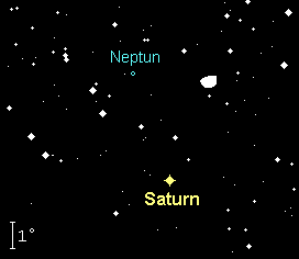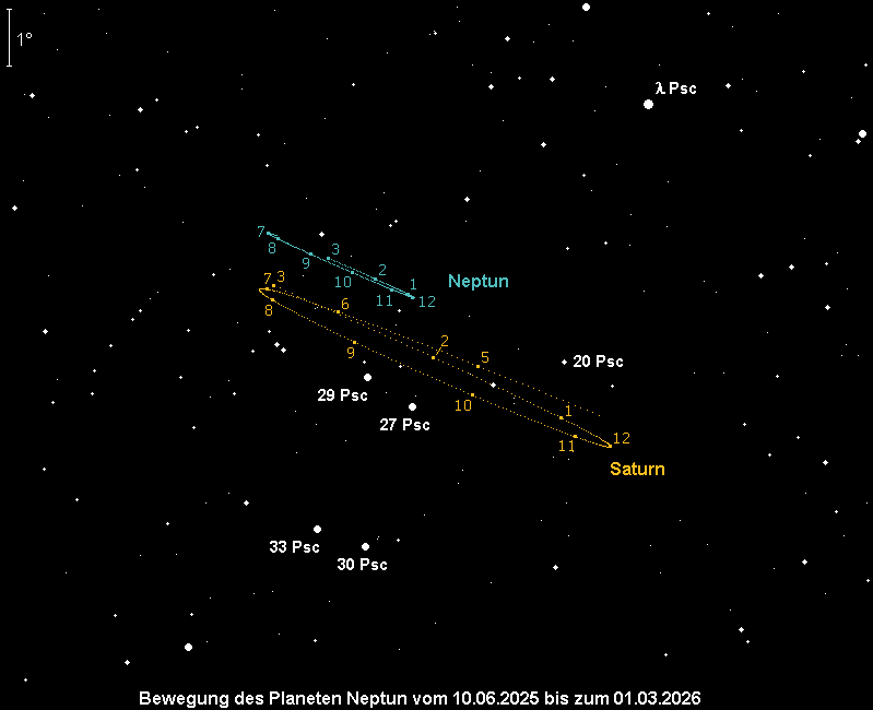 kann bis Mitternacht im westlichen Teil des Sternbilds Fische, etwa 4° links oberhalb von Saturn und nahe der im Fernglas gut erkennbaren Sterne 27, 29, 30 und 33 Psc beobachtet werden. Am 11. Dezember wird der 7.9m helle Planet stationär und wandert anschließend wieder rechtläufig vor der Sternenkulisse entlang. Die beste Beobachtungszeit ergibt sich um seine Kulmination, die zu Monatsbeginn um 19:30 MEZ erfolgt, am Monatsende um 17:45 MEZ. Seine Untergänge verfrühen sich im Monatsverlauf von 1:30 MEZ auf 23:30 MEZ. Etwa zwei Stunden zuvor wird Neptun in den horizontnahen Dunstschichten unsichtbar. Der Mond passiert den Planeten am Vormittag des 27. Dezember. Etwa eine Woche um dieses Datum herum erschwert unser Erdtrabant Neptunbeobachtungen. Im Teleskop zeigt Neptun ein 2.3“ großes Scheibchen, das etwa ab 200x erkannt werden kann. Zudem kann mit größeren Instrumenten sein größter Mond Triton (13.4m) in maximal 16“ Distanz vom Planetenscheibchen ausgemacht werden.