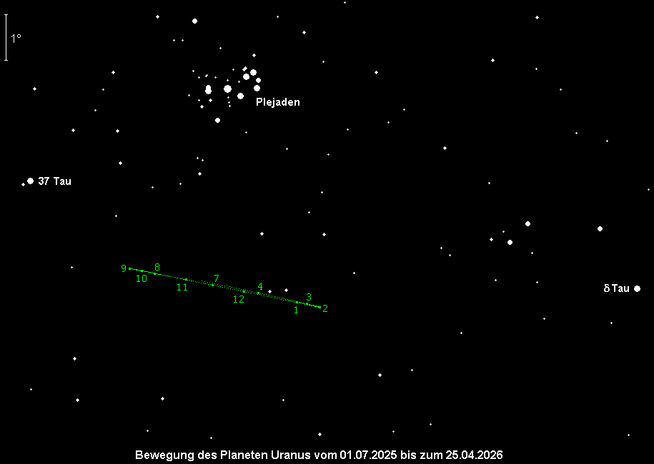 stand Ende November in Opposition zur Sonne und kann damit optimal beobachtet werden. Der 5.6m helle Planet bewegt sich rückläufig im westlichen Teil des Sternbilds Stier, etwa 4° unterhalb der Plejaden. Er ist damit ein einfaches Fernglasobjekt und kann bei optimalen Bedingungen sogar mit dem bloßen Auge ausgemacht werden. Uranus erreicht seine Kulmination am 1. Dezember gegen 23:30 MEZ, am 31. Dezember gegen 21:15 MEZ. Seinen Untergang verlagert er von 7:00 MEZ auf 5:00 MEZ. Der Mond passiert den grünlichen Planeten im Dezember gleich zweimal. Am späten Morgen des 4. Dezember befindet sich der nahezu volle Mond knapp 5° rechts oberhalb und am frühen Abend des 31. Dezember 6.5° links von Uranus. In beiden Nächten dürfte der sehr helle Mond eine Uranusbeobachtung erschweren. Im Teleskop präsentiert Uranus ab etwa 100x sein 3.8“ großes Planetenscheibchen, auf dem allerdings keine Details erkennbar sind. Mit größeren Instrumenten können die beiden hellsten Monde Titania (13.8m, in etwa 30“ Distanz vom Planeten) und Oberon (14.0m / 40“) ausgemacht werden.