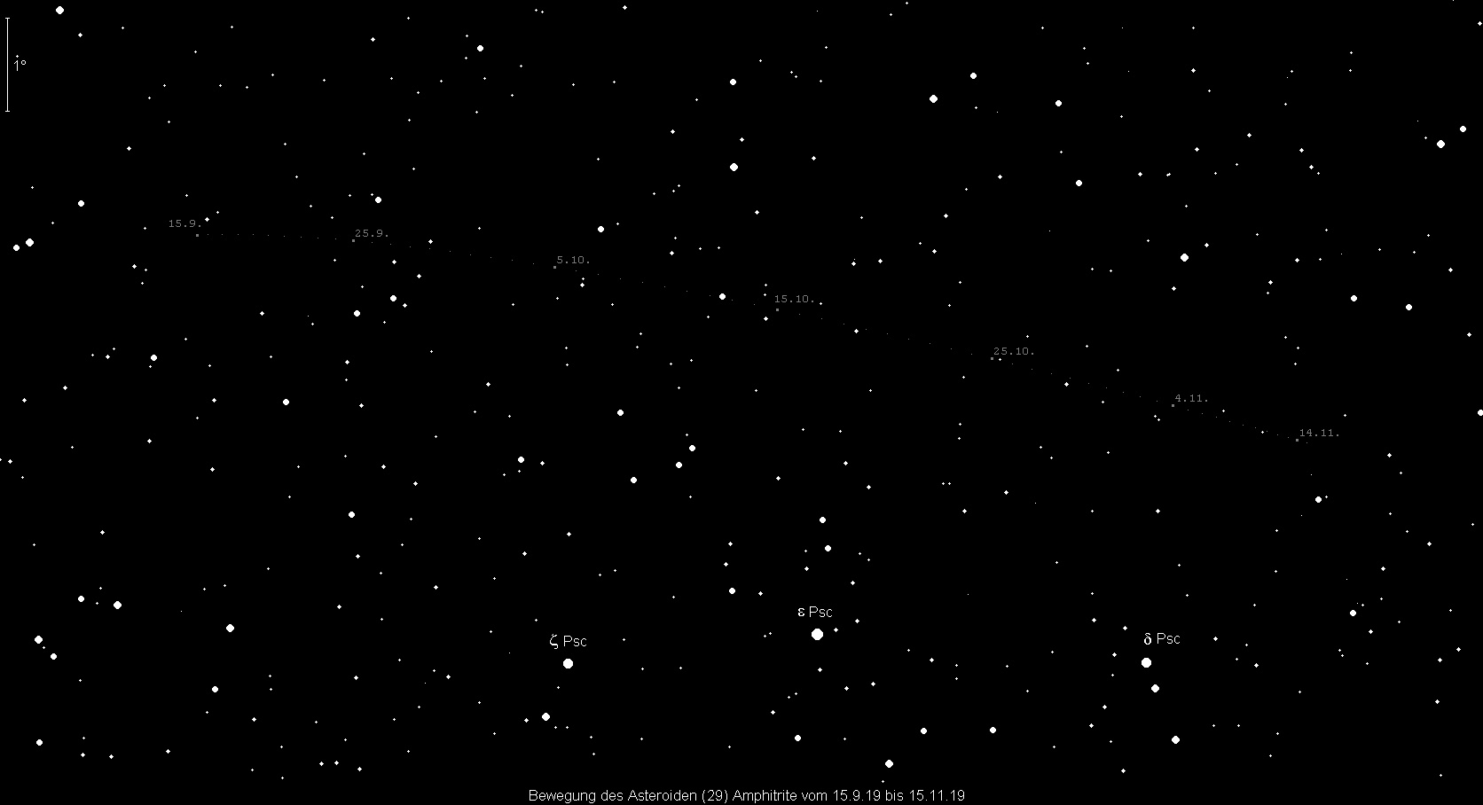 Kleinplanet Nr. 29 verringert seine Helligkeit bis zur Monatsmitte von 9.1m auf 9.5m, so dass er in einem Fernglas nicht mehr gesichtet werden kann. Er bewegt sich rückläufig im Sternbild Fische und passiert zu Monatsbeginn d Psc in 2° nördlichem Abstand. Die beste Beobachtungszeit ergibt sich gegen 22:00 MEZ.