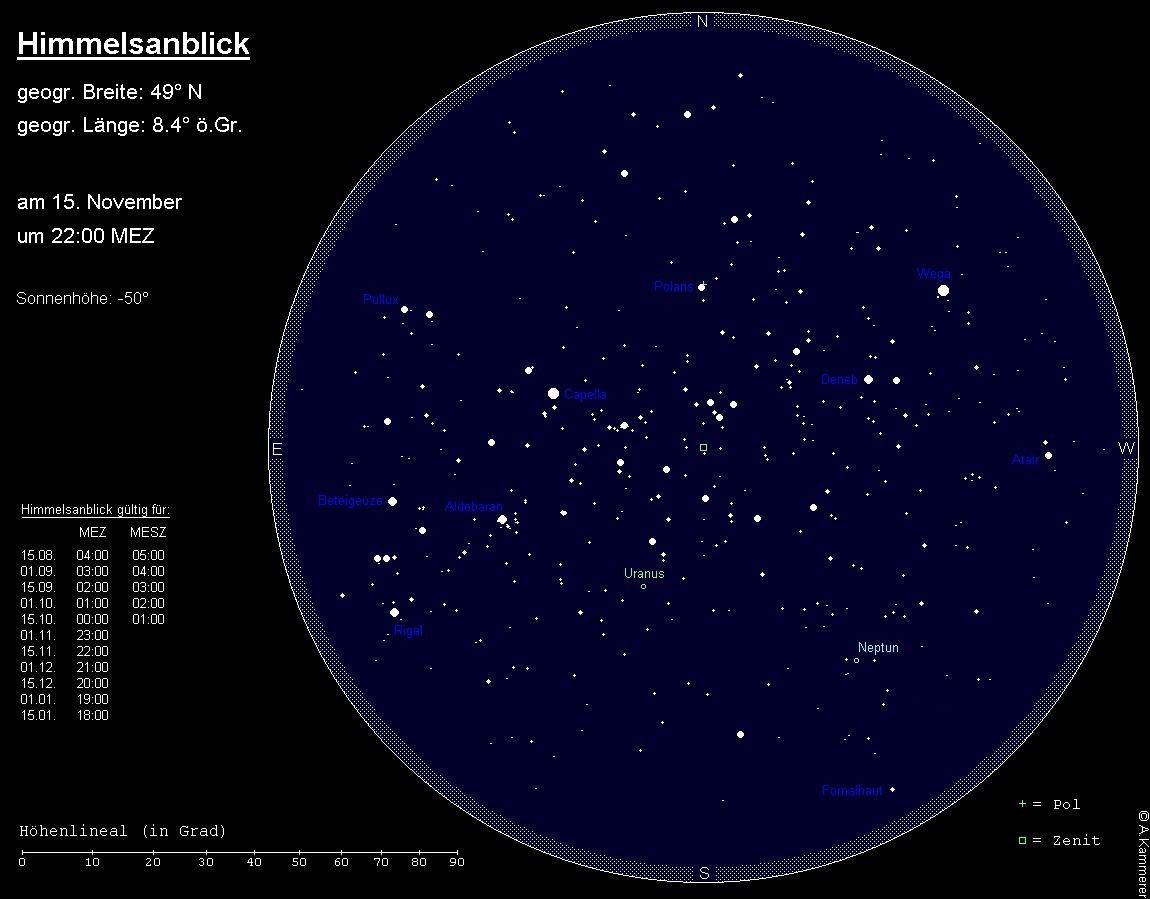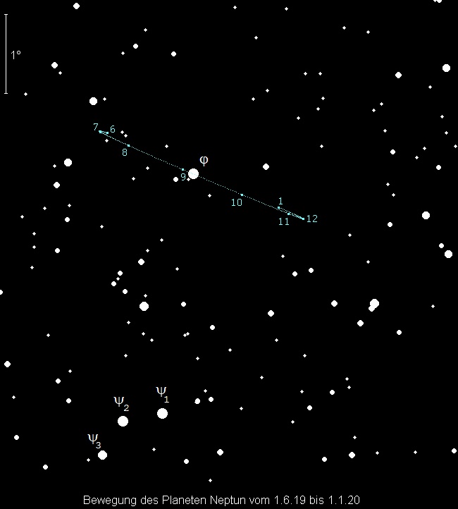 kann am besten – im Fernglas oder Teleskop – bei seiner Meridianpassage beobachtet werden. Diese erfolgt zu Monatsbeginn gegen 20:45 MEZ, am Monatsende um 18:45 MEZ. Der 7.8m helle Gasplanet wandert langsam rückläufig durch das Sternbild Wassermann und entfernt sich immer mehr von j Aqr. Der Mond passiert Neptun am Vormittag des 7. November. Am 27. November wird Neptun stationär und bewegt sich anschließend wieder rechtläufig vor der Sternenkulisse.