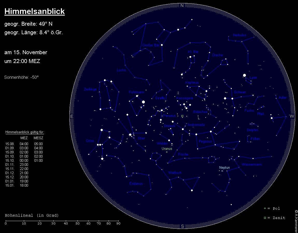 Im Südwesten ist das Sternbild Wassermann dem Horizont schon nahe gerückt. Über ihm zeigt sich das nur aus schwachen Sternen bestehende Sternbild Fische. In größerer Höhe finden wir das große Sternbild Pegasus mit dem aus den vier hellsten Sternen zusammengesetzten Herbst-Viereck. Dabei gehört der nordöstlichste Stern des Vierecks schon nicht mehr zum Pegasus, sondern ist Teil der Sternenkette der Andromeda, die sich östlich des Pegasus erstreckt und eben den Meridian passiert. Am Ende der kurzen, nach Norden weisenden Sternenkette innerhalb der Andromeda finden wir den berühmten Andromedanebel, unsere Nachbargalaxie. Noch immer in großer Höhe können wir das eher unscheinbare Sternbild Eidechse entdecken.