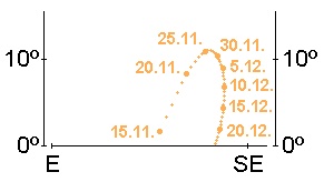 wird ganz langsam am helldämmerigen Abendhimmel zu einem auffälligeren Objekt, steht aber immer noch sehr tief über dem Südwesthorizont. Bereits kurz vor 18:00 MEZ geht sie unter. Am 9. November passiert sie 4° nördlich Antares, doch dürfte es selbst mit einem Fernglas schwierig sein, diese Konstellation zu erkennen. Deutlich einfacher ist es, die Passage der –3.9m hellen Venus an Jupiter zu verfolgen. Am 24. November trennen die beiden hellsten Planeten nur 1.4°, wobei Jupiter an diesem Tag rechts oberhalb der Venus steht. Am 28. November steht der Mond zwischen diesen beiden Planeten - ein bestimmt sehr schöner, allerdings horizontnaher Anblick!