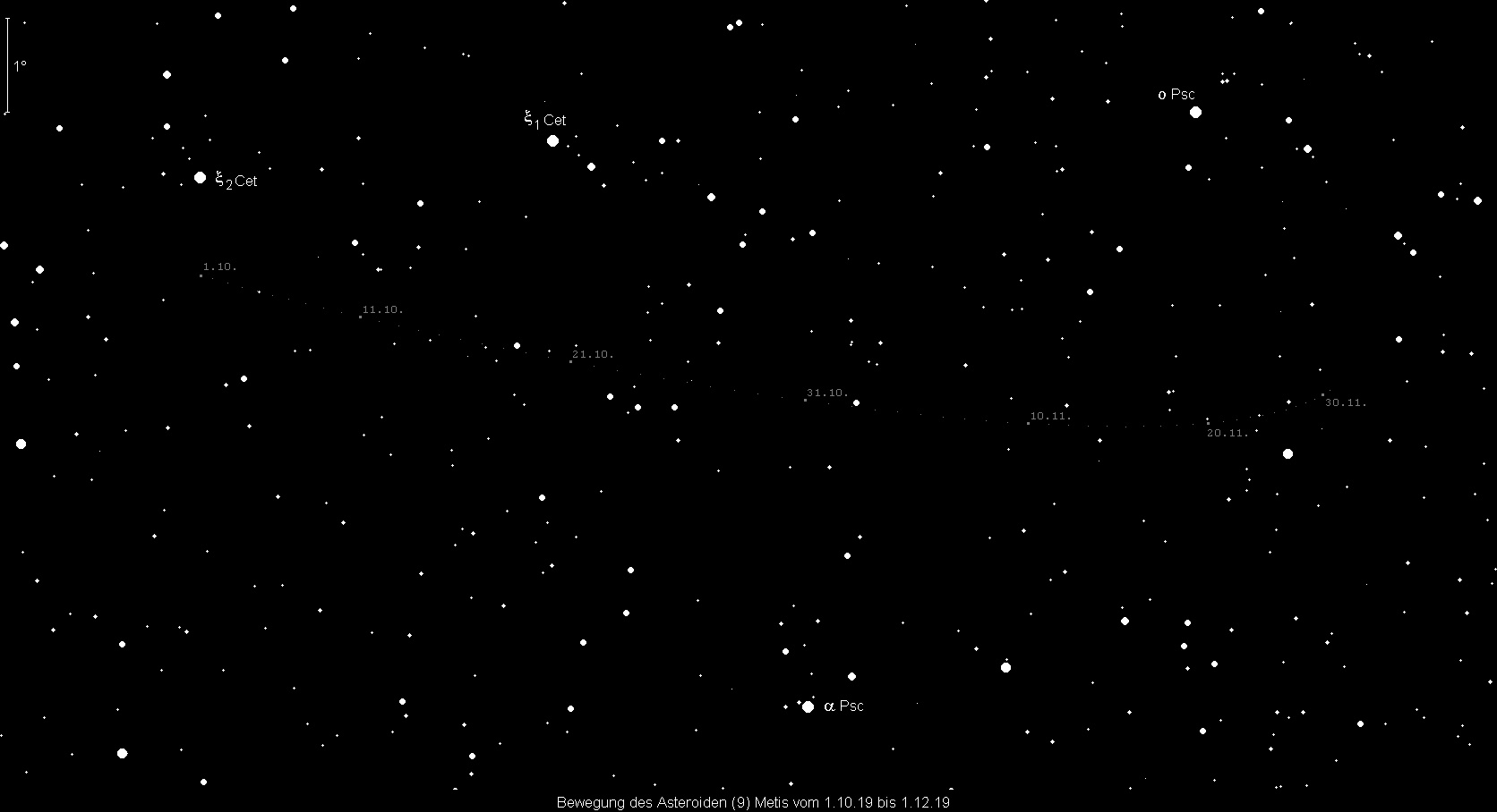 Kleinplanet Nr. 9 wandert rückläufig durch das Sternbild Fische. Seine Helligkeit sinkt von 8.7m auf 9.4m ab, so dass seine Fernglas-Sichtbarkeit zum Monatsende hin endet. Die beste Beobachtungszeit verlagert sich von Mitternacht auf etwa 22:00 MEZ.