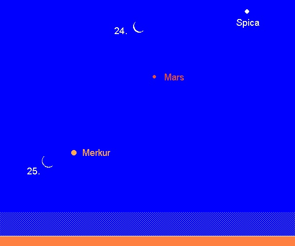 Nur knapp 10 Tage nach dem Merkurdurchgang taucht der flinke Planet aus der hellen Dämmerung auf und ist gegen 6:45 MEZ tief über dem morgendlichen Südosthorizont sichtbar. Am 20. November erst 0.5m hell, steigert er seine Helligkeit bis zum Monatsende auf –0.6m. Am 20. November wird er im Sternbild Waage stationär und wandert von da an rechtläufig durch dieses Sternbild. Am 28. November erreicht Merkur die größte westliche Elongation, wobei ihn 20° von der Sonne trennen. Zum Monatsende sollte er gegen 7:15 MEZ in einer Höhe von knapp 10° auch mit dem bloßen Auge gut erkennbar sein. Am Morgen des 25. November hilft die schmale Mondsichel bei der Identifikation, die etwa 2° links von Merkur steht.