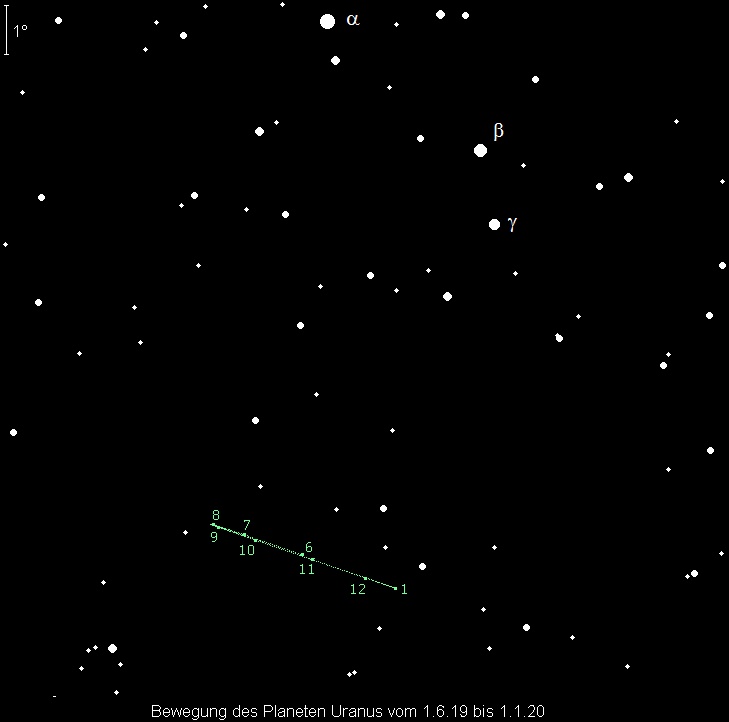 kann nahezu die gesamte Nacht über im Fernglas beobachtet werden. Der 5.7m helle Planet wandert rückläufig durch den südwestlichen Teil des Sternbilds Widder. Teleskopbeobachter können nach dem 3.7“ großen Scheibchen und den hellsten Monden - Titania (13.9m) und Oberon (14.1m) - schauen. Der Mond passiert den grünlichen Planeten am Morgen des 11. November in 5° südlichem Abstand.