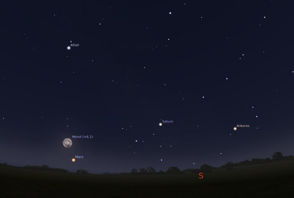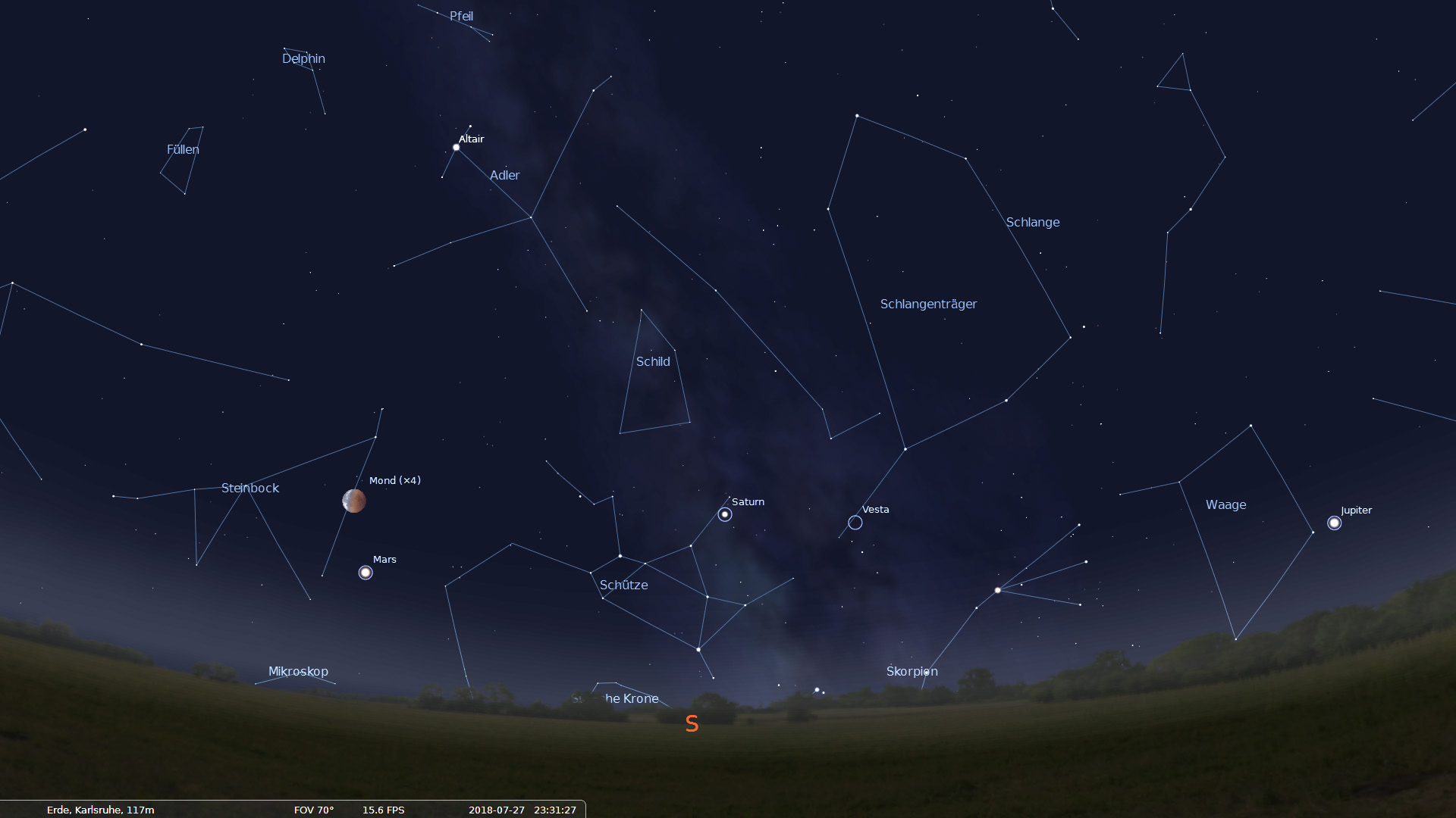 Der Planet Mars, der um 21:45 aufgeht, und am besten nach Mitternacht tief im Süden beobachtet werden kann, erreicht nur einen Tag später seine Oppositionsstellung und steht damit der Sonne gegenüber. In dieser Stellung kommen sich Erde und Mars etwa alle zwei Jahre nahe, die stark elliptische Bahn des Mars führt aber bei dieser Opposition zu einer besonders geringen Entfernung. Dabei wird Mars am Himmel besonders hell, noch heller als Jupiter. In Teleskopen erreicht Mars jetzt seine beste Beobachtungsmöglichkeit und er ist auch besonders groß. Im Teleskop auf der Sternwarte können bei guten Luftverhältnissen sogar Oberflächendetails gesehen werden. Erst in 17 Jahren wird Mars wieder ähnlich gut zu beobachten. Allerdings steht Mars sehr tief am Horizont und erreicht in der Nacht zu Samstag im Süden frühmorgens um 1:41 gerademal 16° Horizontabstand. Mars wird noch über den gesamten August und dann früher am Abend gut zu sehen sein.