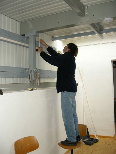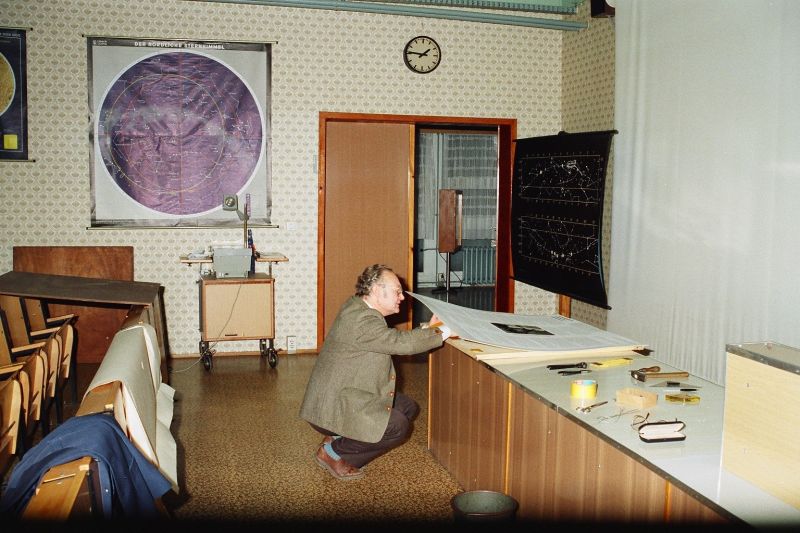 1979 konnte die Volkssternwarte auf das Max-Planck-Gymnasium in Rüppurr im Süden von Karlsruhe verlegt werden, auf dessen Dach seit 1959 ein historischer Steinheil-Refraktor von 16,5 cm Durchmesser steht (siehe Geschichte des Refraktors und der Sternwarte). Mit Zuschüssen der Stadt Karlsruhe konnte 1988 das historische Objektiv durch einen modernen Halbapochromaten der Firma Lichtenknecker von 15 cm Durchmesser ersetzt werden. Kurz vorher konnte ebenfalls mit Mitteln der Stadt Karlsruhe ein Spiegelteleskop mit 28 cm Durchmesser (Celestron C11) zur Verbesserung der Sternwartenarbeit angeschafft werden.